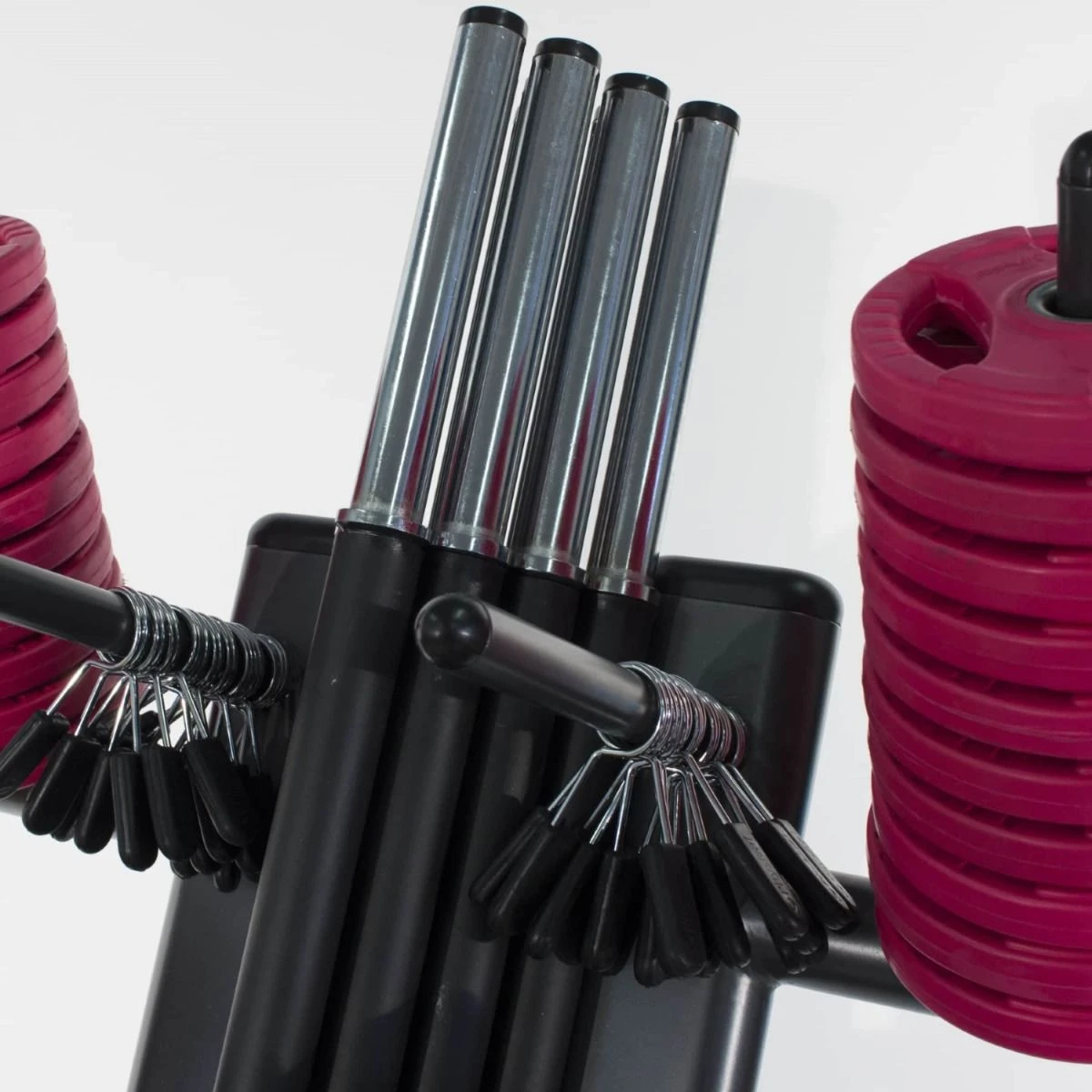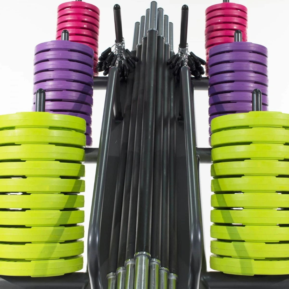 A great addition to any gym or fitness centre this body pump club pack comes with 12 pump sets and storage rack with black bars and coloured discs. This is a great package for studio and group exercise sessions at your facility. The rack provides a simple and effective way to store 12 physical pump sets without cluttering the gym floor and takes up minimal floor space. The rack will allow you to hold all the 1”/30mm discs, the bars and spring collars. It may also hold 1 inch discs from other manufacturers as well.