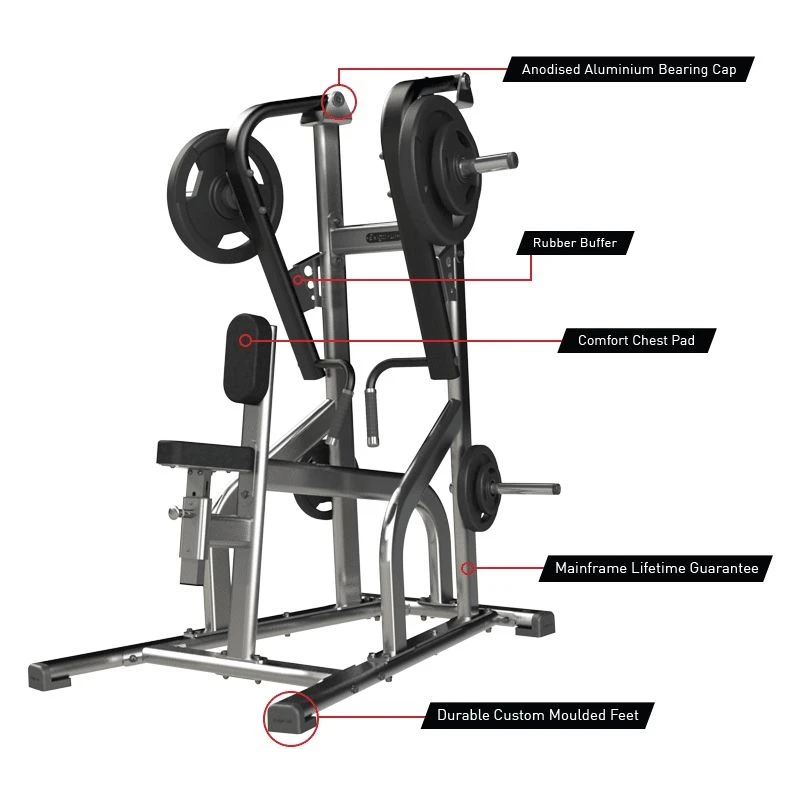 The lateral row targets your mid back nicely. By targeting the lats, rhomboids, teres major and minor, infraspinatus and your middle and lower trapezius you get a superb balanced workout, which is enhanced thanks to the Exigo Plate Loaded ISO lateral Row Machine. Machines usually have a fixed range of motion so therefore may not be comfortable for everyone. This ISO Lateral movement from Exigo allows for converging and diverging movements to mimic the arcs of motion that our body’s use.