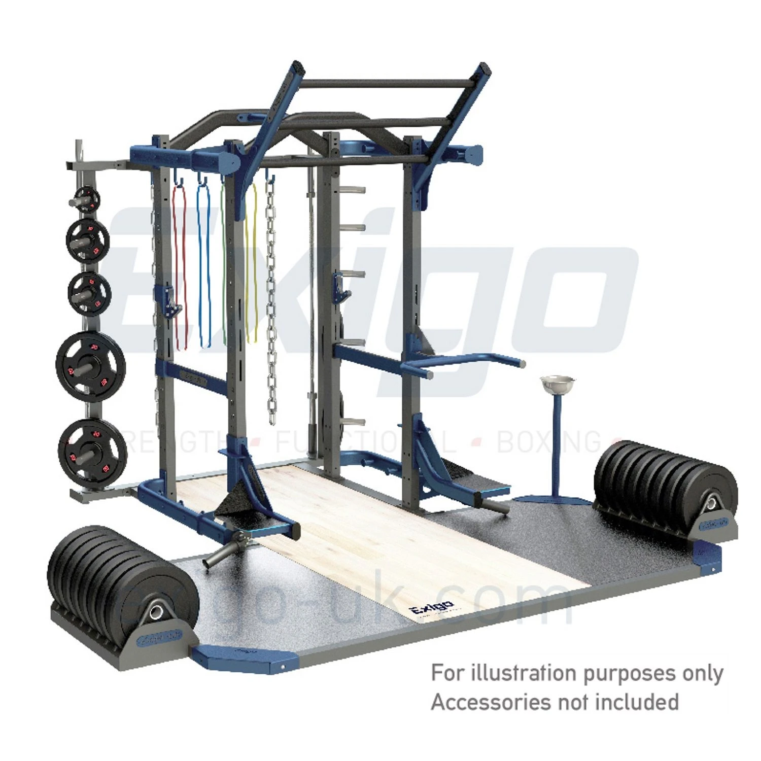 The Exigo elite power rack system is a heavy duty piece of kit and comes with a multi grip chinning bar and rear weight storage pegs so you can store all your weight discs nearby. Made in the UK, it comes with a lifetime warranty on the frame so it will not let you down and it can even be customised to your requirements with a choice of frame colours. There is also the option of adding integrated lifting platforms to give you the complete lifting system. (Please contact us for details).