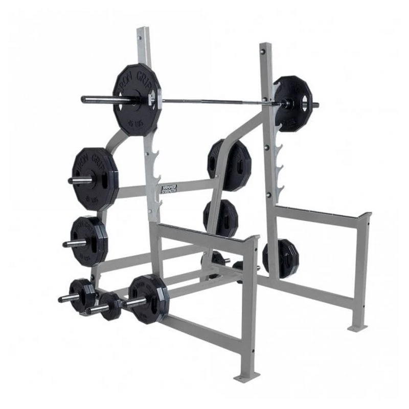 An essential part of any strength gym, increasingly squat racks are being bought by those with home gyms too. The Hammer Strength Olympic Squat is a heavy-duty squat rack with self storage for your Olympic weight discs.