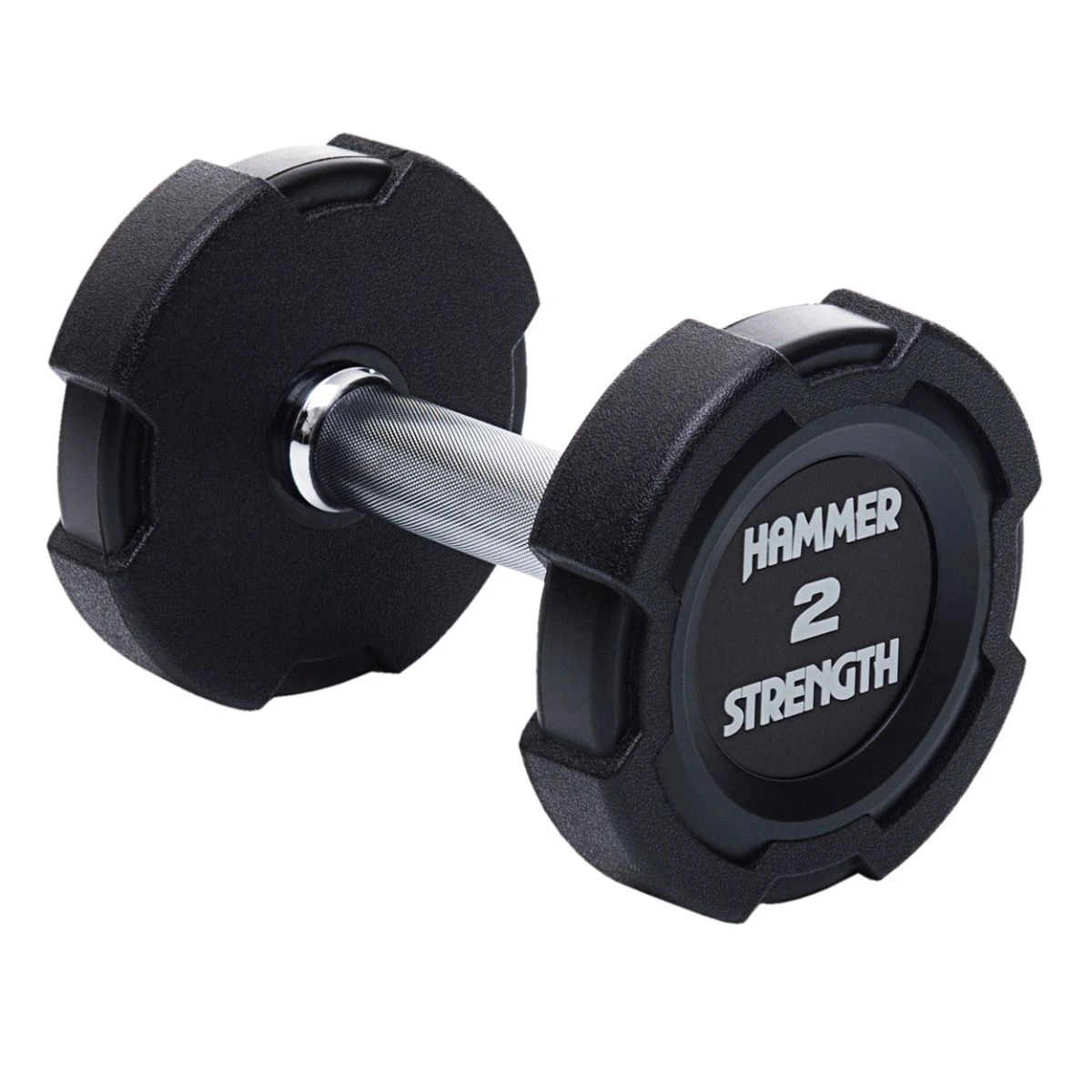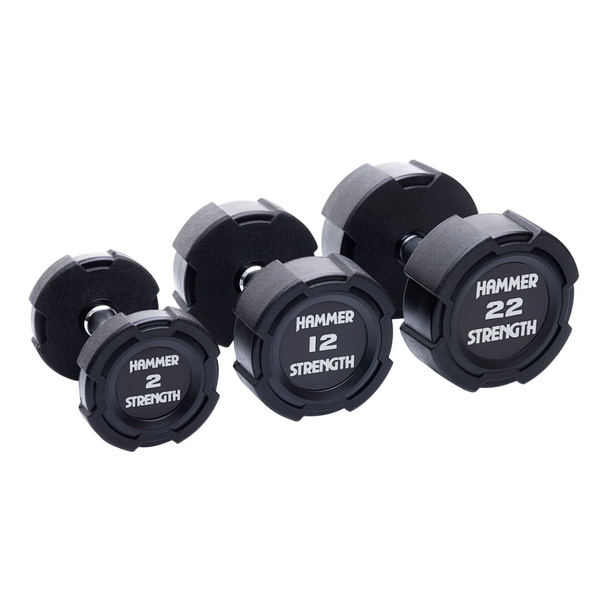 Superb high quality urethane dumbbells. For one of the most used pieces of equipment in any gym, buying good quality really pays off. These Hammer Strength dumbbells offer a stylish and durable finish along with the knowledge they have the latest anti-roll ‘X’ design for safety and style.