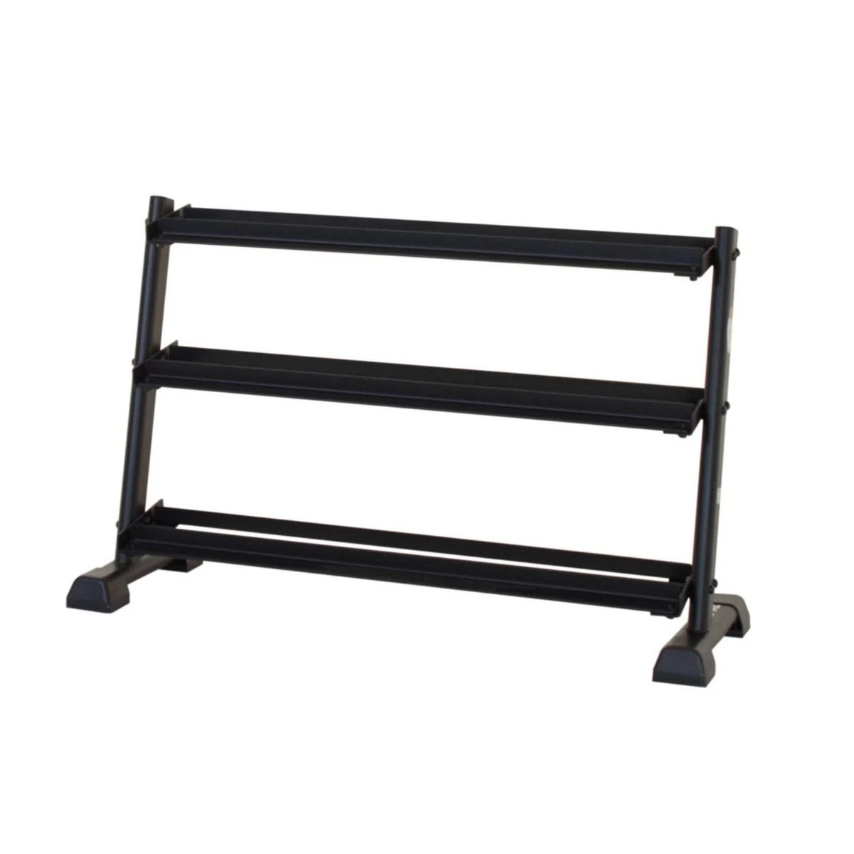 This flat tray 3 tier rack is suitable for a home gym or commercial fitness facility. It is designed to hold up to 10 pairs of dumbbells but you can always put 2 next to each other to hold more.
