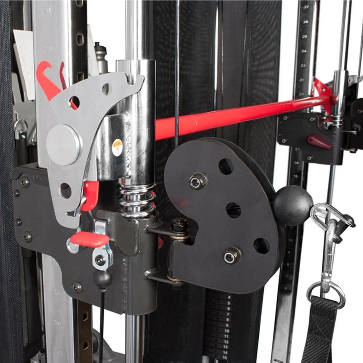 With an 8 point pulley system (2 wide adjustable pulleys with 32 height positions, 2 high pulleys and 4 low points) you can perform an endless number of functional training exercises. Once you’ve finished performing pulley exercises simply hook up the red smith bar to create your very own smith machine. This allows you to perform squats, deadlifts, and chest presses. The bar rotates much like a traditional smith system and the innovative weight multiplier doubles the maximum resistance for heavier lifters. Watch the product video for more information on this fantastic piece of gym equipment.