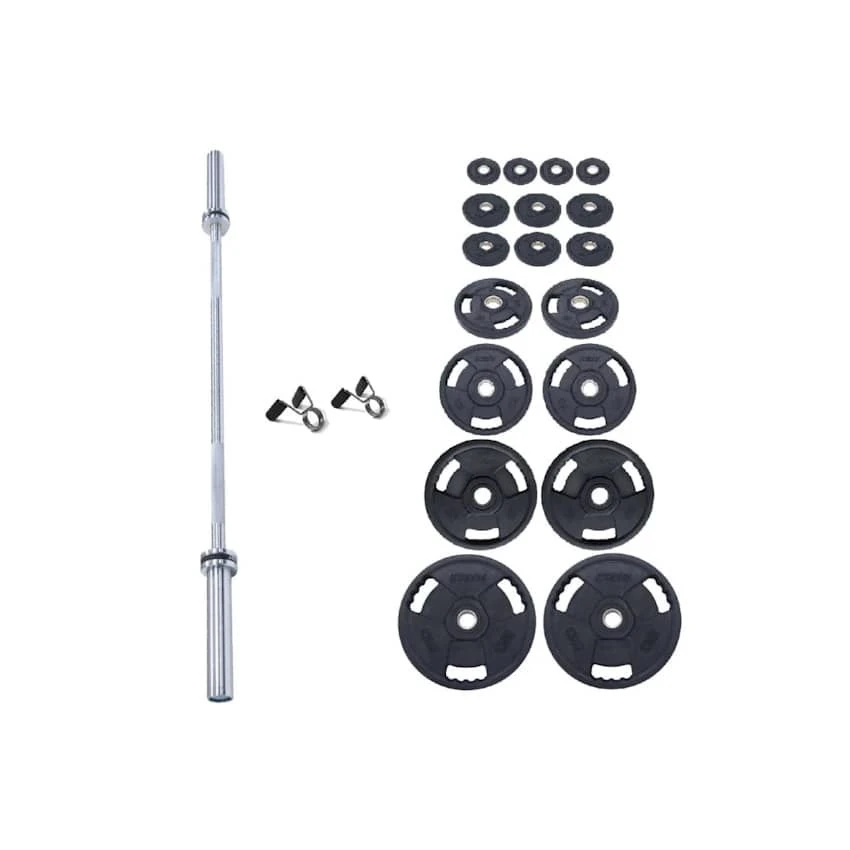 The Olympic bar with this set has bearings for smooth use and contains the following;