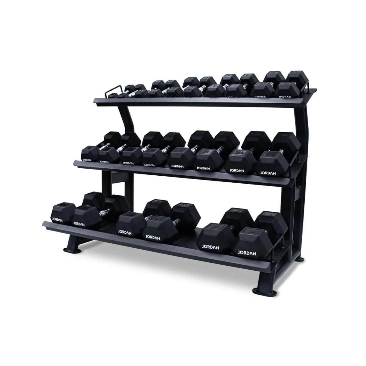 Whether for a home gym, or a commercial gym, you need to select the right rack for your dumbbell set. Often the hex dumbbell sets are not a great fit for more traditional rack and saddle options. This is where the Jordan Hex Dumbbell rack offers the right solution. The flat shelving means the dumbbells sit neatly and are easy to access – you also don’t skin your knuckles lifting heavier weights on and off.
