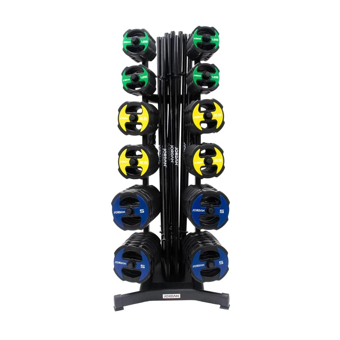If you are a gym owner or run body pump classes and need somewhere to store all your bars and discs after sessions then this body pump bar storage rack is the perfect solution. It can store up to 12 of our Jordan coloured pump sets and 8 alternative sets. It is sturdy and durable and makes all the bars and discs easily accessible.