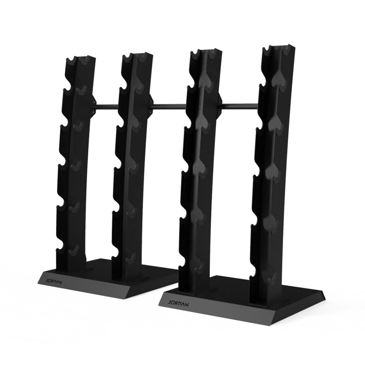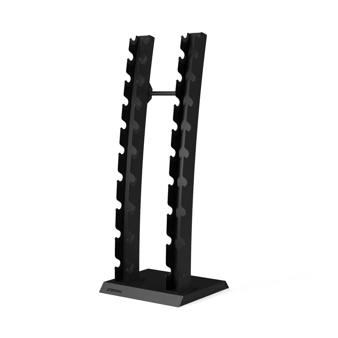 Withe rack The rack measures 1570mm in height, 740mm in length and 600mm in depth and comes in an attractive silver, textured paint finish. The new design of the Jordan vertical dumbbell rack is sturdy and secure for optimal storage of your free weights.