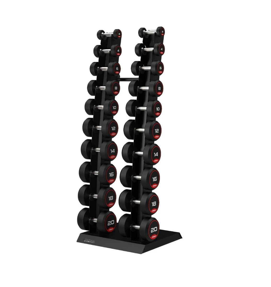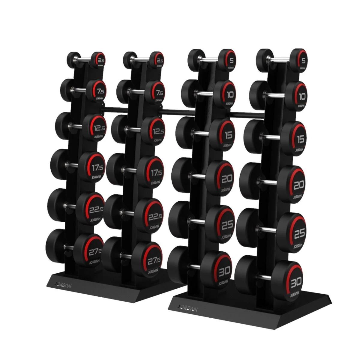 There are 2 options available depending on the dumbbell set you choose (1-10kg or 2-20kg) and both store 10 pairs of Jordan rubber or urethane dumbbells.