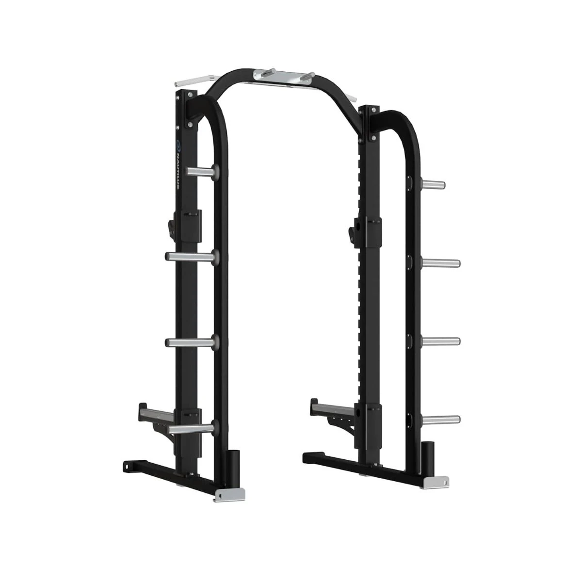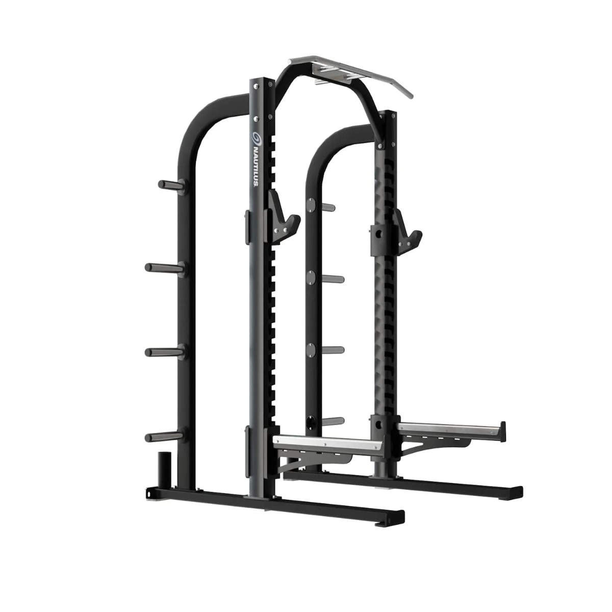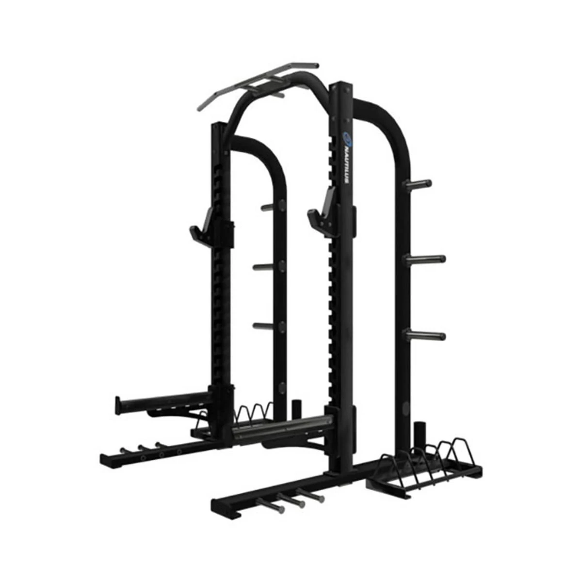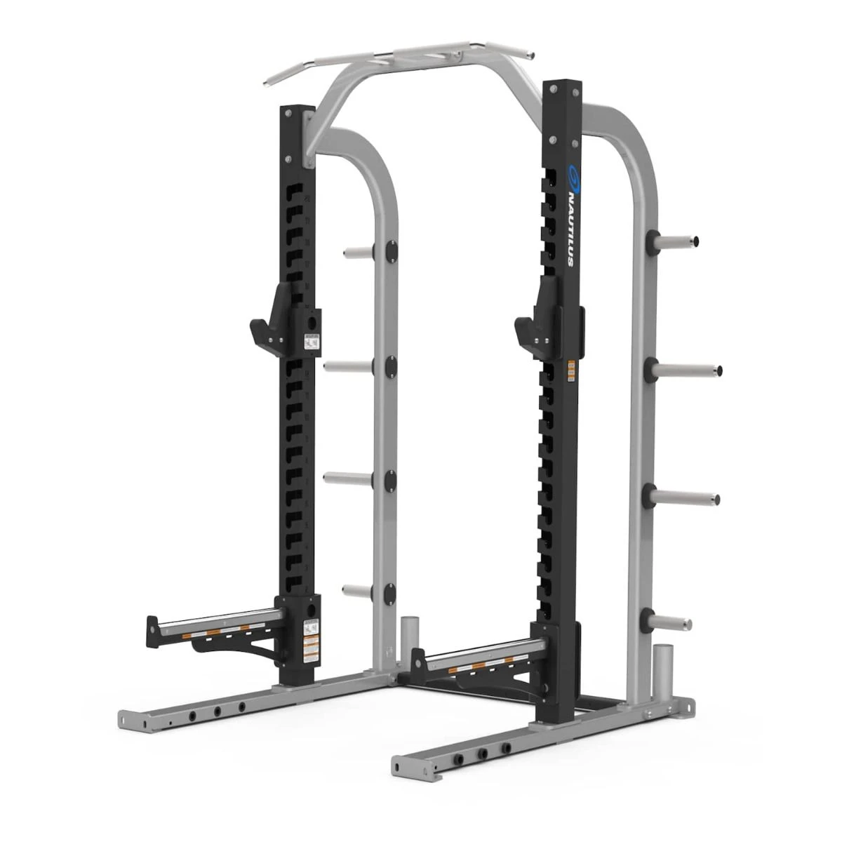 The Nautilus Half Rack – perfect for smaller gyms and home gyms alike. Smaller than a full cage, this half rack comes as a package with the safety spotter arms and J-Hooks. You also get the plate storage horns and pull ups bars at the front too. This makes it a compelling option for lots of gyms in the home or garage. At 24m tall you will need about 2.7m ceiling clearance.