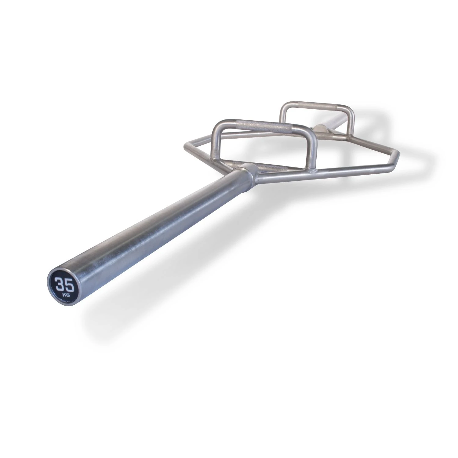 This is a heavyweight Olympic bar that’s found in most strength gyms and larger commercial gyms with a free weights section. The Pro Olympic Hex Bar allows you to lift heavy weights whilst you stand in the centre of the bar. This helps to reduce the stress and tension that is usually caused to the spine from a straight bar during a lift. Weighing in at 35kg, this bar can take a maximum weight of 300kg+.
